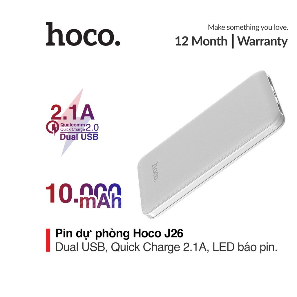 Pin dự phòng sạc nhanh 2.1A Hoco J26 đèn Led báo sạc dung lượng 10000mAh chip bảo vệ chống cháy nổ"Bảo hành: 12 tháng, 1 đổi 1 trong tháng đầu nếu lỗi do nhà sản xuất.