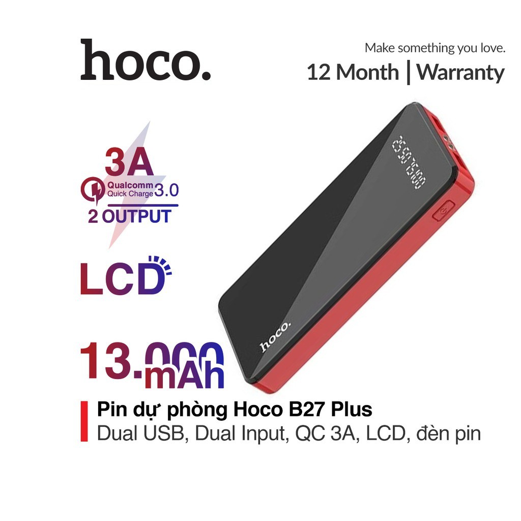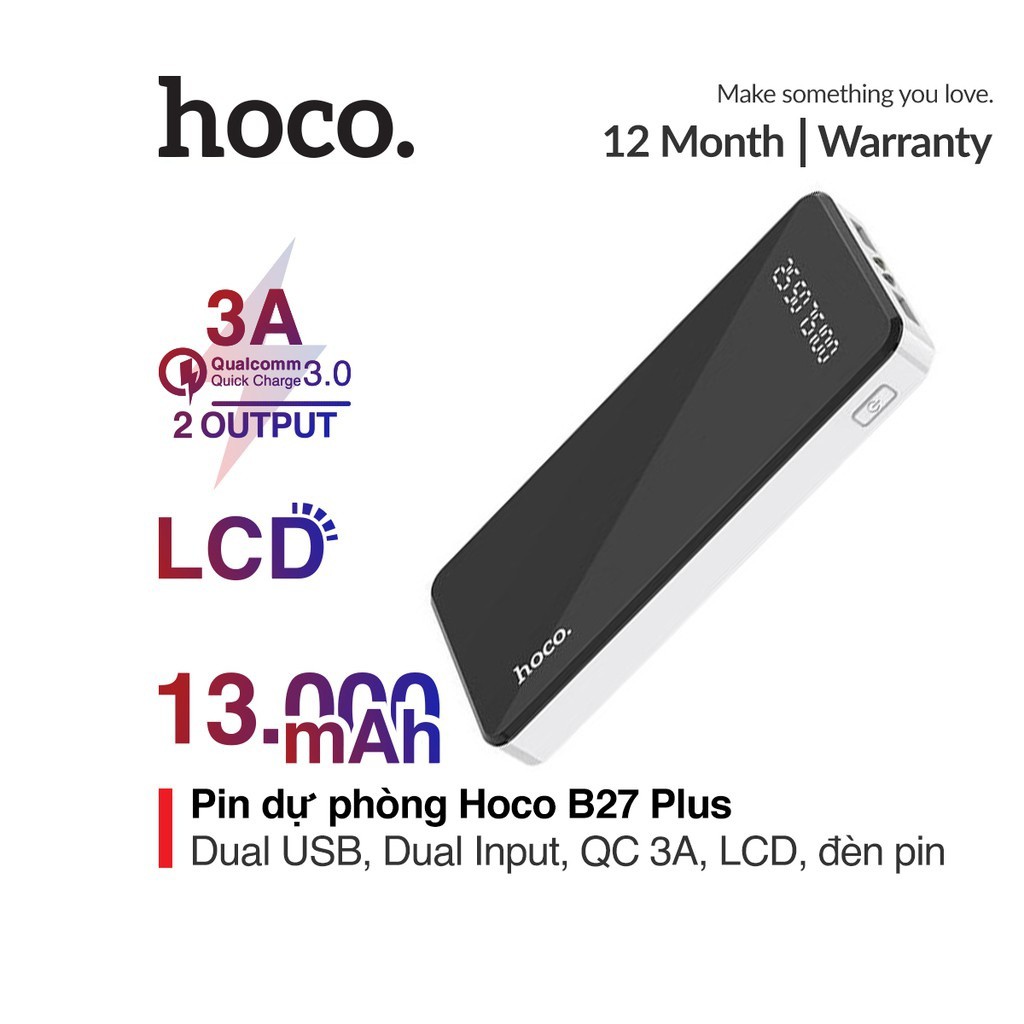 Pin dự phòng sạc nhanh 3A Hoco B27 Plus tích hợp đèn Led dung lượng 13000mAh nhựa ABS chống cháy cao cấp"Bảo hành: 12 tháng, 1 đổi 1 trong tháng đầu nếu lỗi do nhà sản xuất.