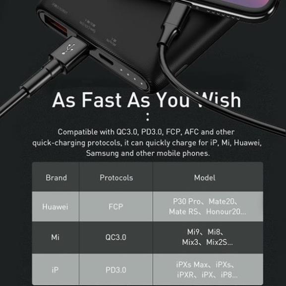 + Pin Baseus Bipow tương thích với QC3.0, PD3.0, FCP, AFC và các giao thức sạc nhanh khác. Hỗ trợ sạc nhanh hầu hết các dòng điện thoại smart phone như: iPhone. Xioami, Huawei, Samsung và một số dòng điện thoại di động khác trên thị trường. Do vậy, bạn không cần phải lựa chọn mẫu cáp sạc điện thoại nào cho phù hợp nữa.