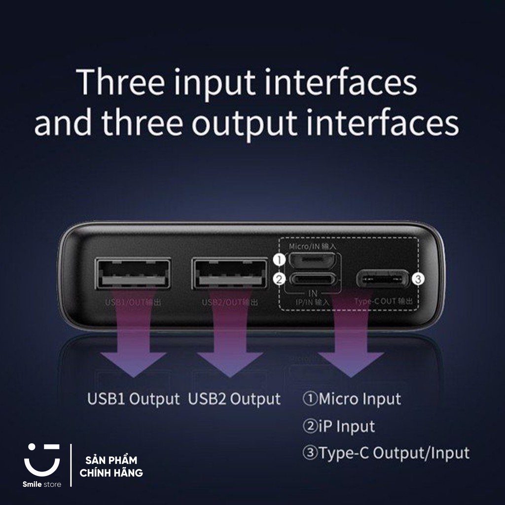 - Cổng vào : được trang bị 3 cổng sạc ngỏ vào gồm Micro và Type C . Trong đó cổng Type C hỗ trợ sạc nhanh đồng thời cả in và out (Bi-directional quick charging). Việc trang bị cả 3 cổng sạc ngỏ vào cho phép bạn bạn có thể sạc cho pin bằng chính cáp của điện thoại mà không cần trang bị thêm cáp sạc riêng.