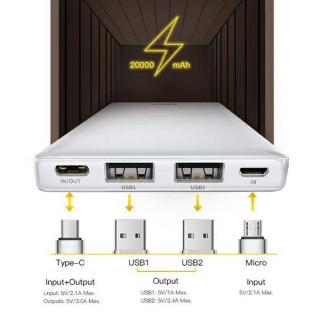 - Ngỏ vào : Micro và Type C (input) cho phép bạn bạn có thể sạc cho pin bằng chính cáp của điện thoại mà không cần trang bị thêm cáp sạc riêng . Thời gian sạc đầy pin từ 4.5h đến 6.5 giờ (tuỳ bộ sạc)