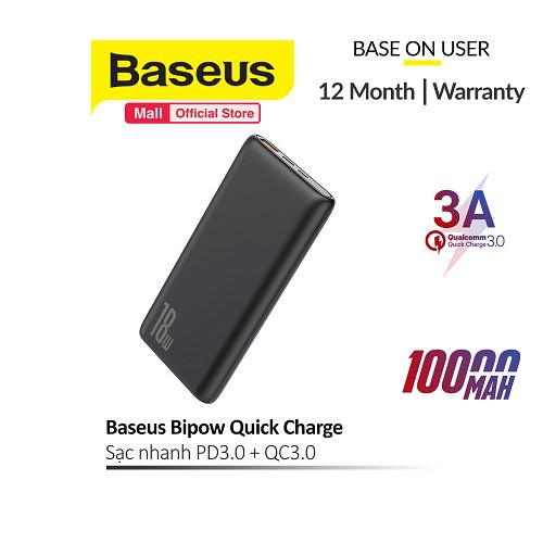 Điện Thoại & Phụ Kiện > Pin sạc dự phòng > 5000 - 10000mAh || Pin dự phòng siêu nhanh Baseus Bipow 10000mAh 18W PD+QC được trang bị 3 cổng USB out, Type-C in/out, Micro in tiện lợiCòn hàng