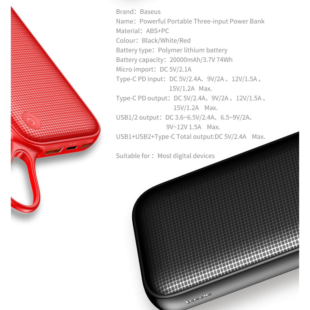 • Baseus Mạnh Mẽ Di Động Ngân Hàng Điện Chất liệu: ABS + PC Dung Lượng pin:20000mah Micro Đầu Vào:DC 5 V/2.4AType-c.