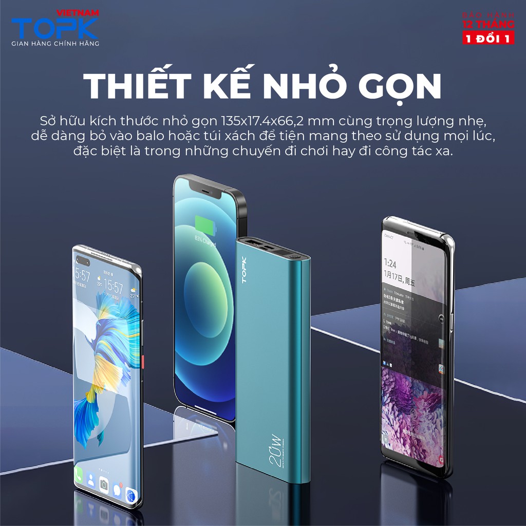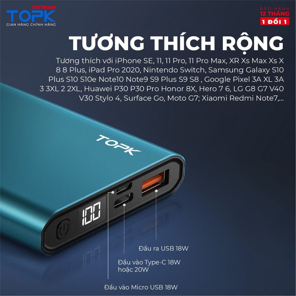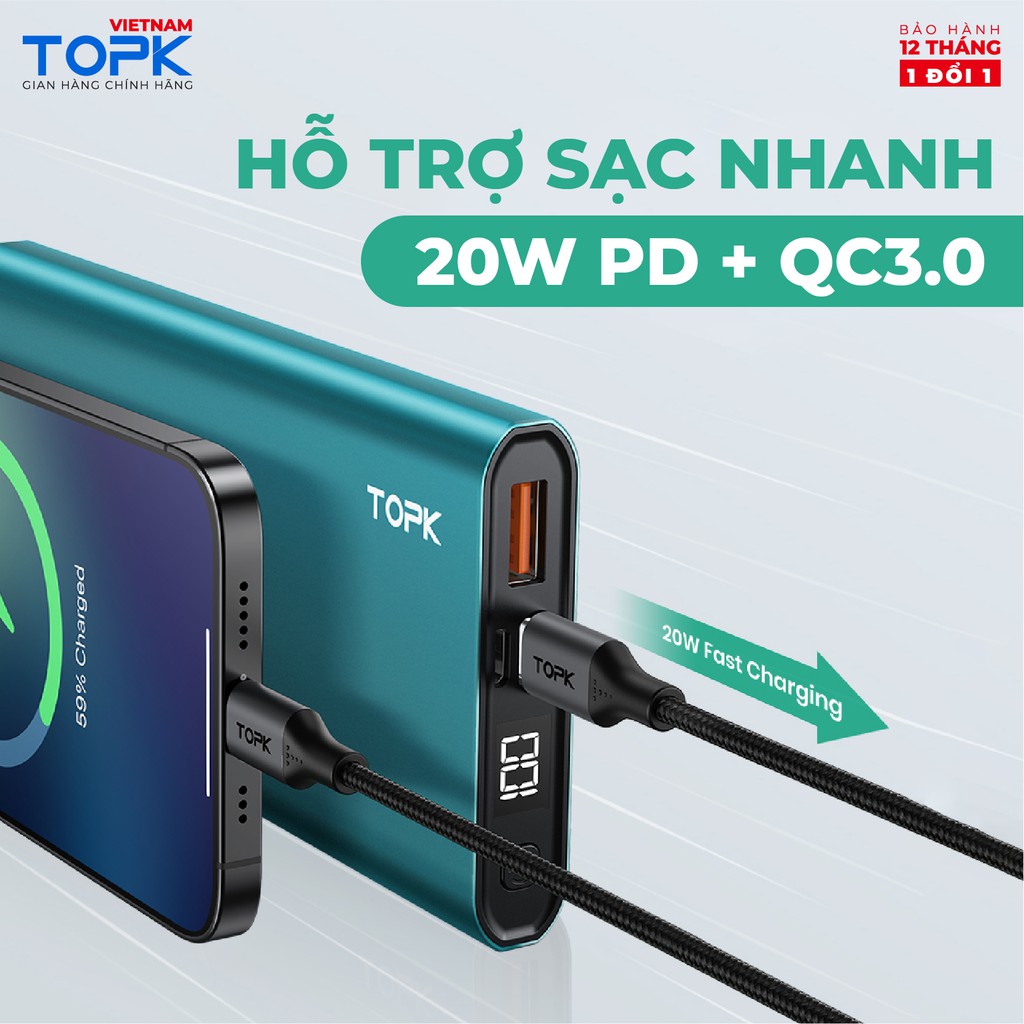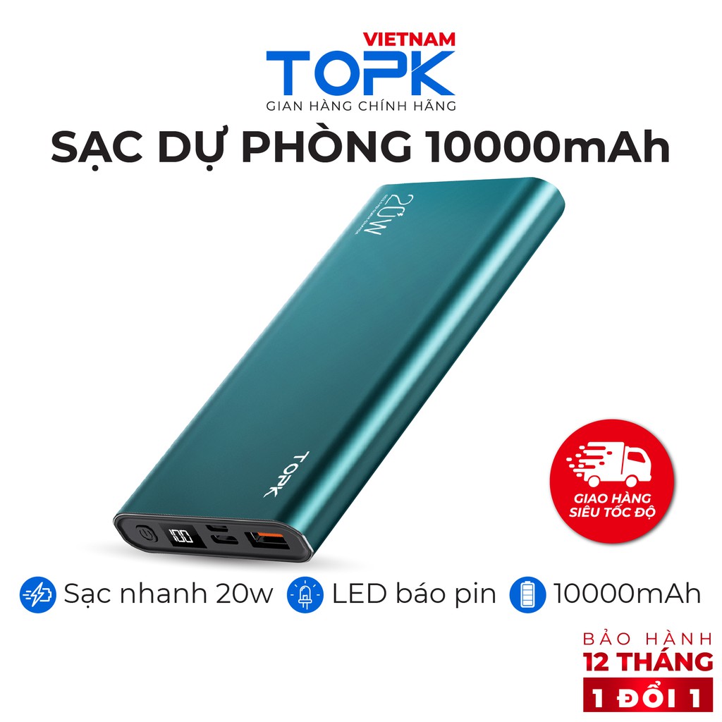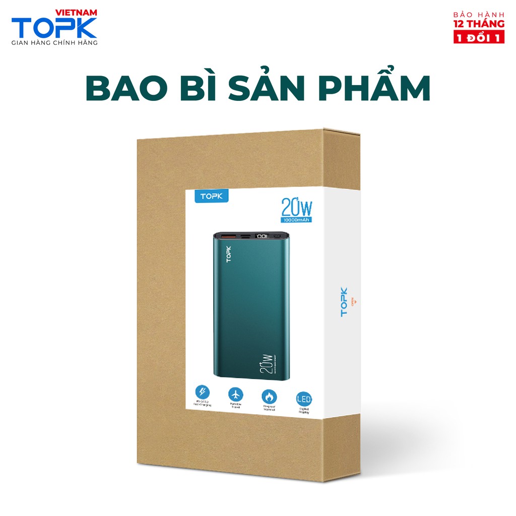 Sạc dự phòng 10000mAh TOPK I1007P Sạc nhanh 20W PD QC3.0 màn hình LED hiển thị Hàng chính hãng Bảo hành 12 tháng 1 đổi 1THỜI GIAN GIAO HÀNG SIÊU TỐC ĐỘ