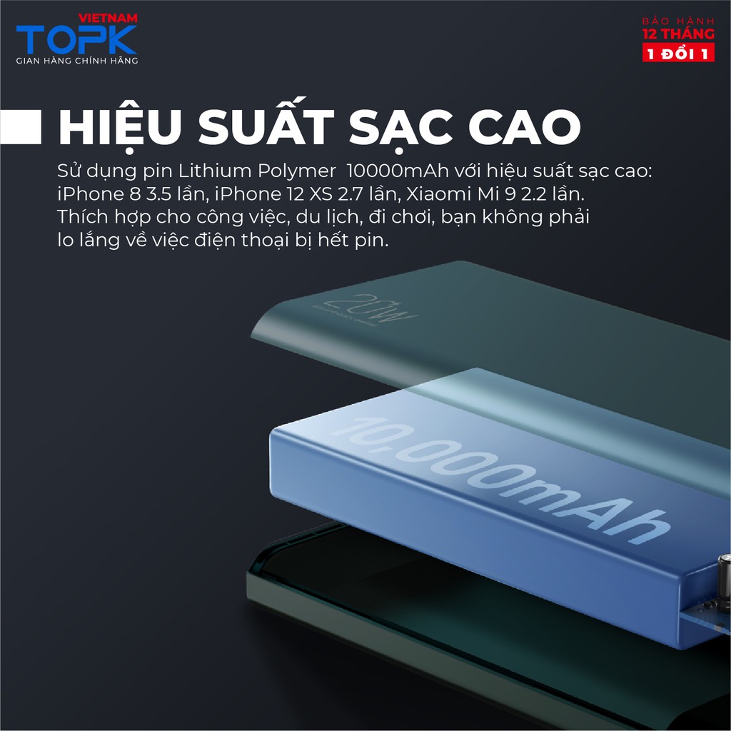 - Hiệu suất sạc cao: Bộ sạc điện thoại di động TOPK I1007P sử dụng pin Lithium Polymer 10000mAh với hiệu suất sạc cao: iPhone 8 3.5 lần, iPhone 12 XS 2.7 lần, Xiaomi Mi 9 2.2 lần. Thích hợp cho công việc, du lịch, đi chơi, bạn không phải lo lắng về việc điện thoại bị hết pin.