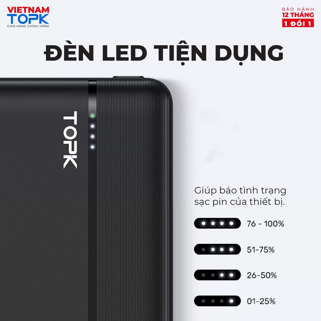 - Hiệu suất sạc cao: Bộ sạc điện thoại di động TOPK sử dụng pin Lithium Polymer 10000mAh với hiệu suất sạc cao, sạc lại 2.7X cho iPhone XS, 3.5X cho iPhone 8, …