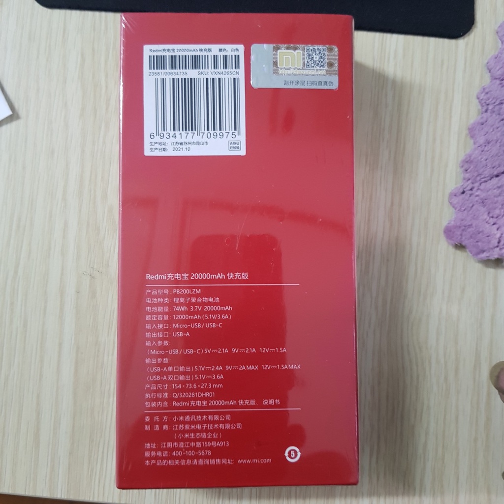 Thông số chi tiết pin sạc dự phòng Redmi 20000mAhModel: PB200LZM
