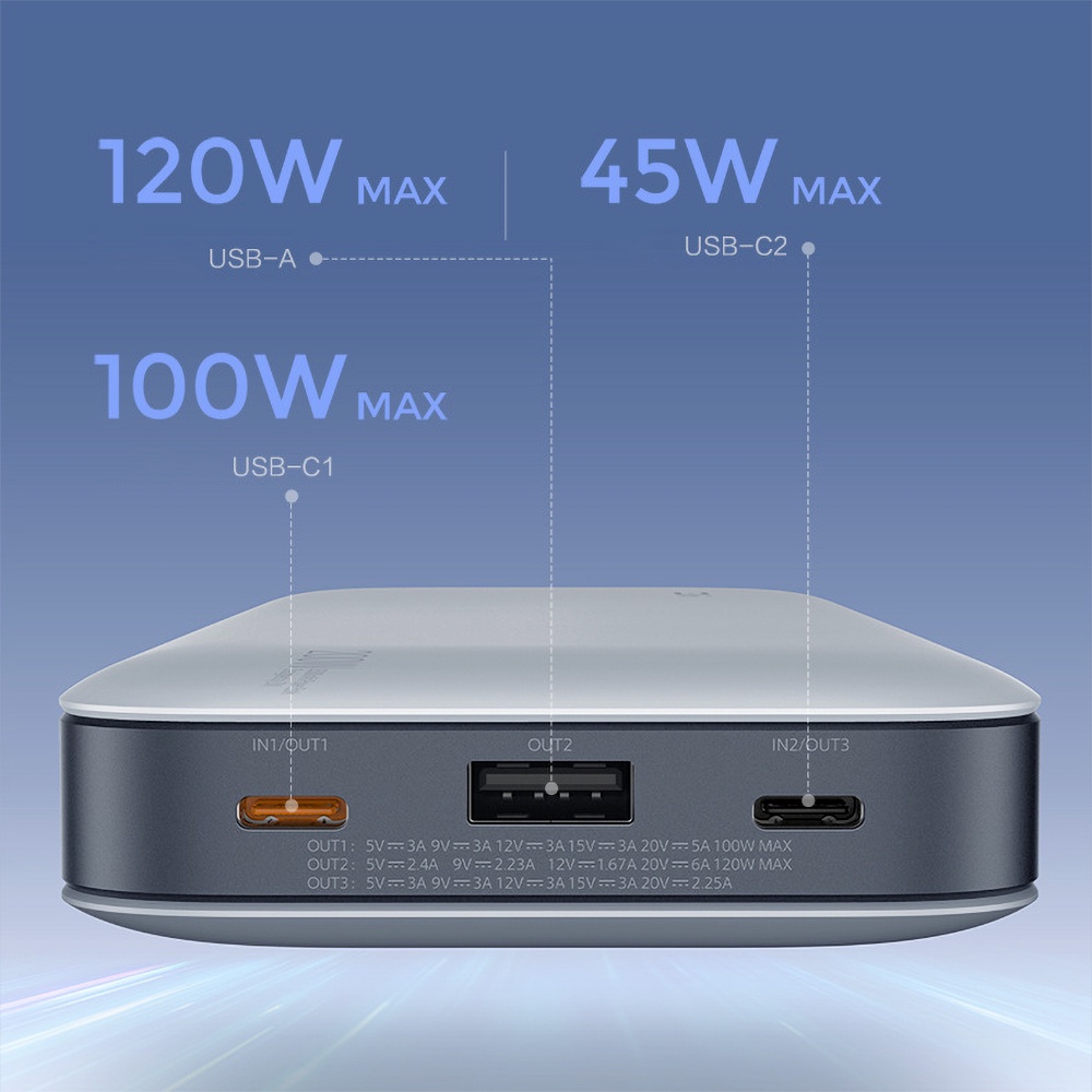 USB: 5V/2.4A, 9V/2.23A, 12V/1.67A, 20V/6A 120W MAX