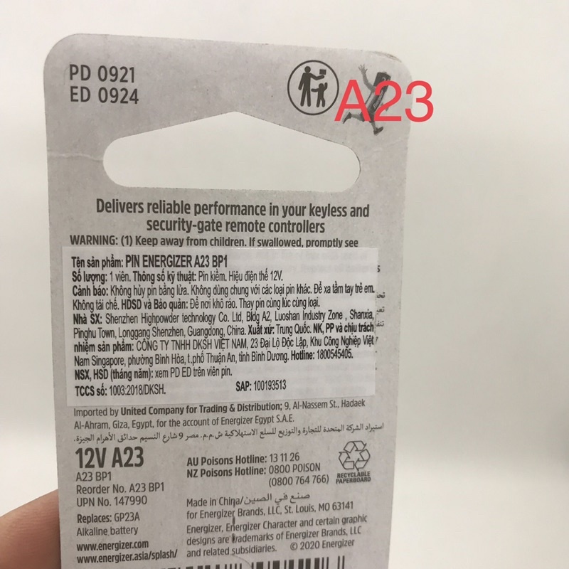 Pin A23 Energizer là dòng pin Alkaline mang thương hiệu Energizer (Mỹ) với khả năng lưu trữ cao, chất lượng ổn định, chiếm vị thế cao trong thị trường Việt Nam và quốc tế.Pin A23 thường được sử dụng thay thế cho các loại chuông cửa, báo cháy cám ứng, điều khiển cửa cuốn, mái hiên di động, đèn led cảm biến...