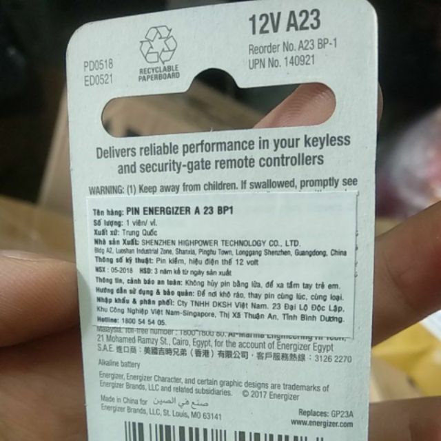 - Hãng sản xuất : Energizer . Xuất xứ : Liên doanh USA-China