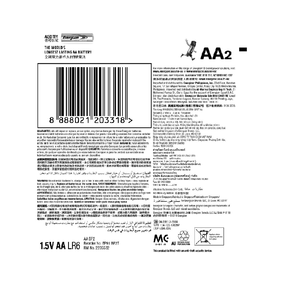 Nhà SX: Energizer Singapore Pte., Ltd 25 Gul WayJurong, Singapore 629197.