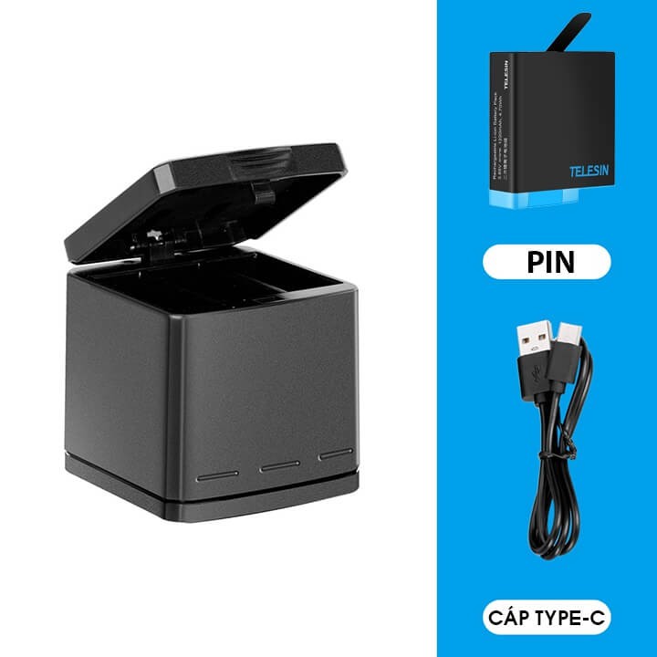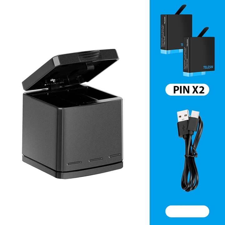 Dock sạc Gopro 5 và 6 có thể sạc cùng lúc 3 viên pin rất tiện dụng, có thể cắm sạc với pin dự phòng hoặc củ sạc của điện thoại. Với bộ Pin và sạc Telesin cho GoPro bạn thoải mái quay phim và chụp hình.