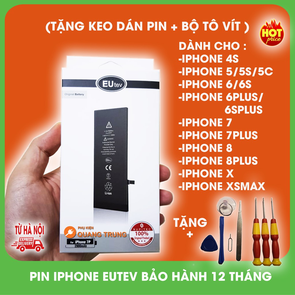 Pin iphone EUtev là một trong những dòng pin được bảo hành chính hãng 12 tháng bởi công ty Supitec