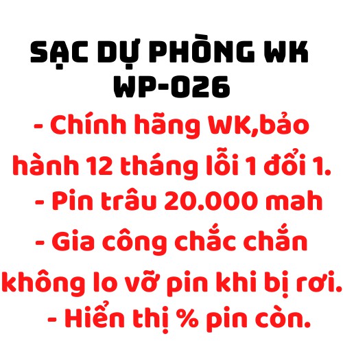 ✔️SAM STORE ra mắt sản phẩm : ⚡Pin khủng⚡ sạc dự phòng wk-wp 026 dung lượng 20.000 mah sạc siêu nhanh,sạc 1 lúc 2 thiết bị,bảo hành 12 tháng-samstore