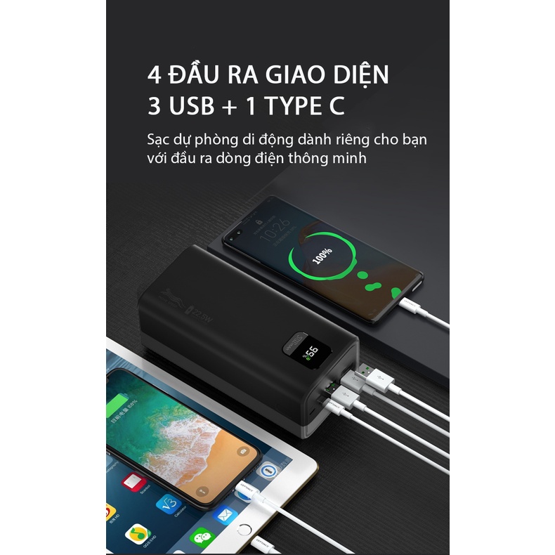 - Giao diện đầu ra USB hỗ trợ sạc nhanh 22,5W QC 3.0, QC 2.0, FCP, SCP,... có thể sạc được hầu hết các thiết bị điện thoại di động và máy tính bảng của các hãng như Apple, Xiaomi, Samsung, Huwei,...