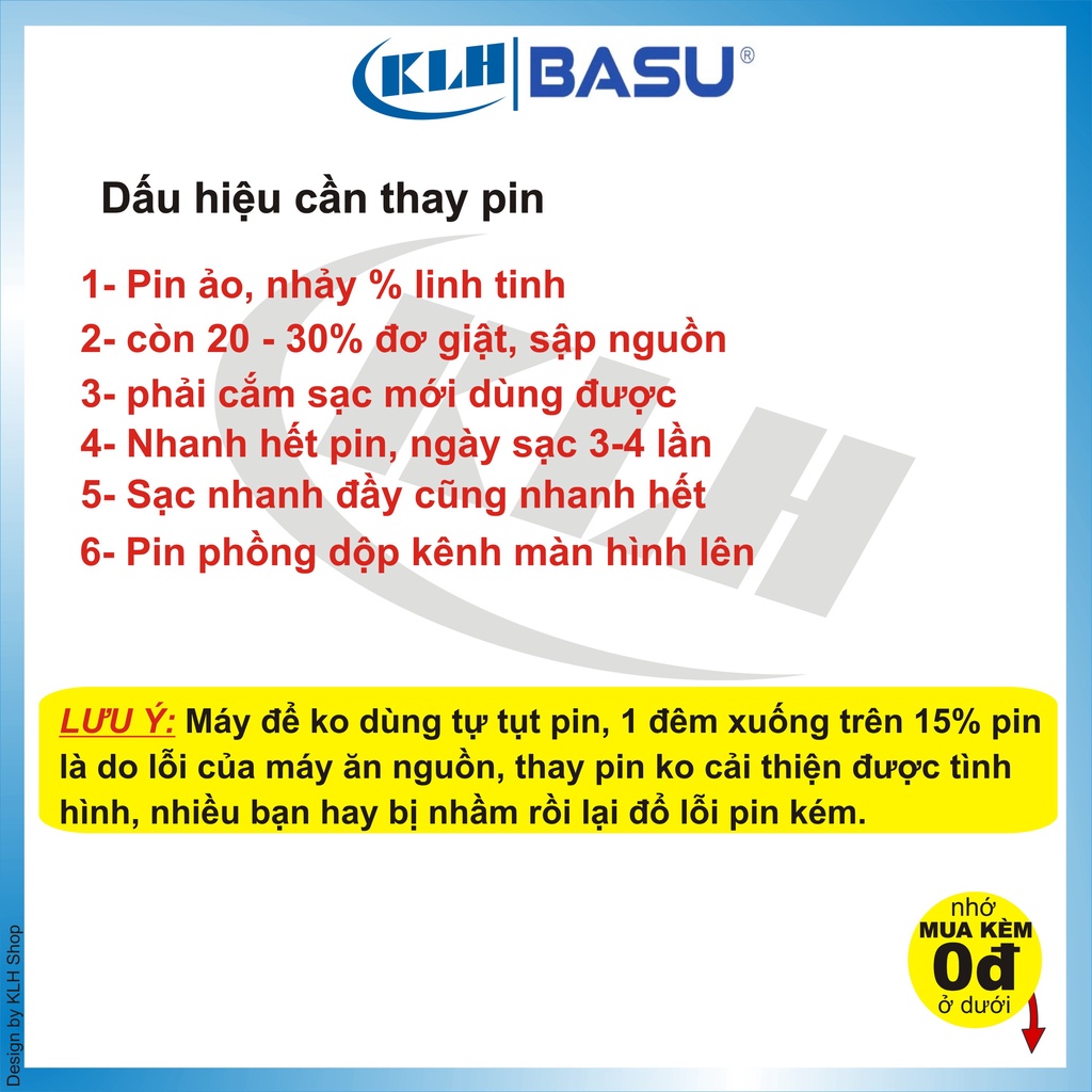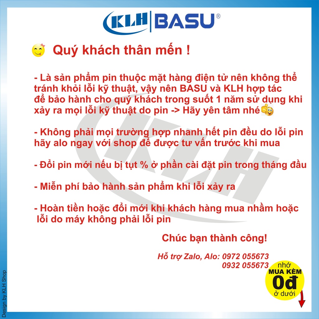 ++ CAM KẾT- Là nhà bán lẻ được ủy quyền chính thức trực tiếp từ BASU, KIM LONG HIỆP (KLH Shop) cam kết mang đến tay khách hàng những viên pin chuẩn nhất và cao cấp nhất của BASU. Tất cả sản phẩm của quý khách được chấp nhận bảo hành trên toàn quốc tại các showroom và trung tâm bảo hành của BASU.