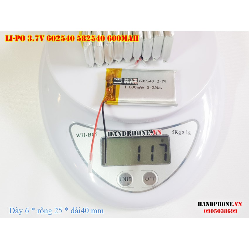 Thiết Bị Âm Thanh > Khác || Pin Li-Po 3.7V 600mA 602540 582540 (Lithium Polyme) cho loa bluetooth, máy nội soi, cân điện tử, camera, đồng hồCòn hàng