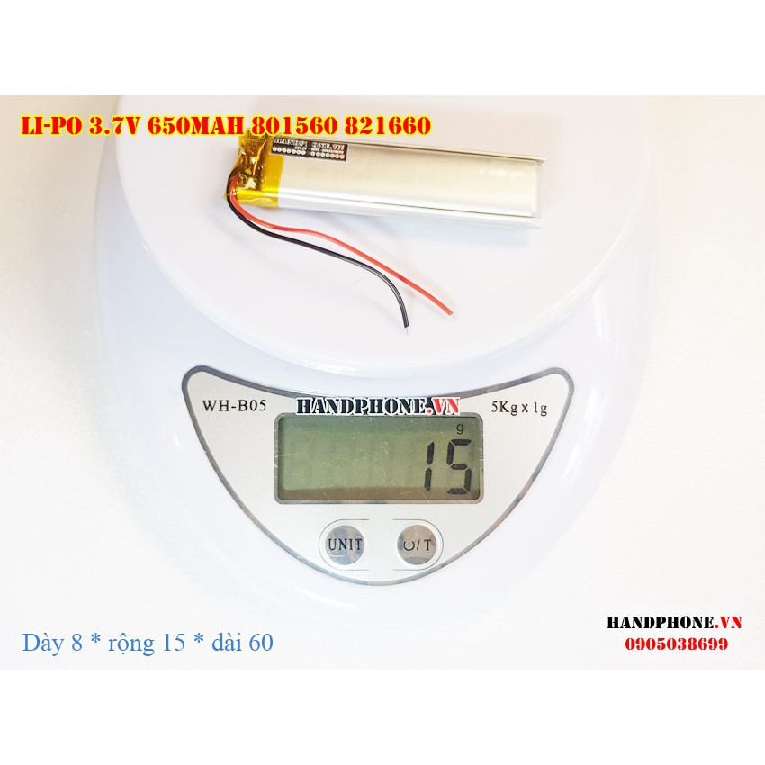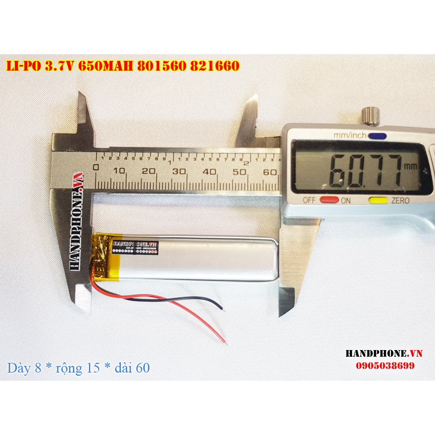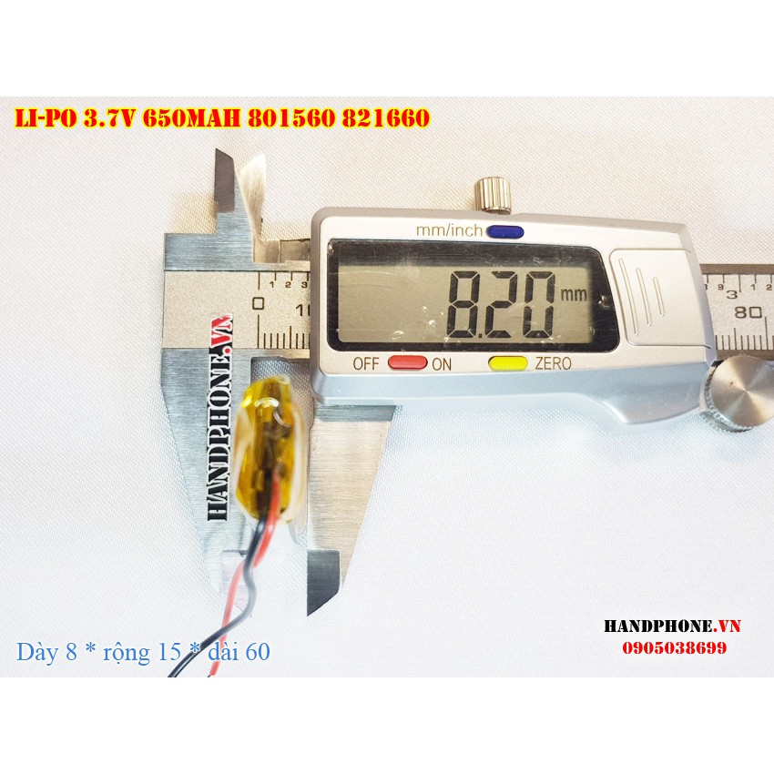 Pin Li-Po 3.7V 650mA 801560 821660 (Lithium Polyme) cho loa bluetooth, máy nội soi, bàn phím bluetooth, khóa vân tay