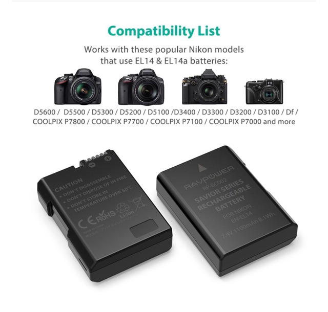 Khả năng tương thích đa dạng: Làm việc với các Model Nikon phổ biến sử dụng pin EL14 & EL14a: D3100 / D3200 / D3300 / D5100 / D5200 / D5300 / D5500 / D5600 / P7000 / P7100 / P7700 / P7800 / ...