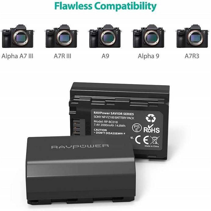 Pin máy ảnh Sony NP-FZ100 Ravpower có dung lượng 2000mAh lớn hơn so với các pin khác chỉ 1500mAh. Cũng giống như pin gốc NP-FZ100 sử dụng cell pin chất lượng cao làm cho việc tổn hao dung lượng sau hàng trăm lần nạp xả xuống mức thấp nhất. Pin Ravpower NP-FZ100 tương thích với Sony Alpha A7 III, A7R III, A7R3, A9 và Alpha 9, sản phẩm đang được bán tại thietbiquayphim.com với giá tốt nhất thị trường.THÔNG SỐ KỸ THUẬT:
