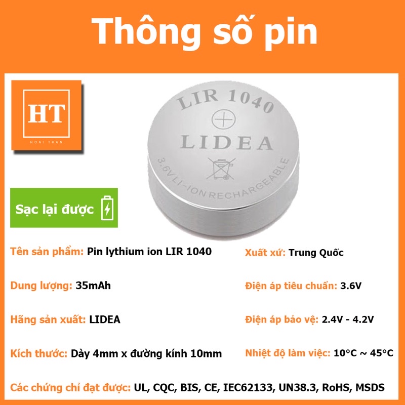 Giới thiệu Pin nút Li-ion 3.6V LIR1040 35mAh (Lithium ion) cho tai nghe Bluetooth TWS, có thể sạc lại được