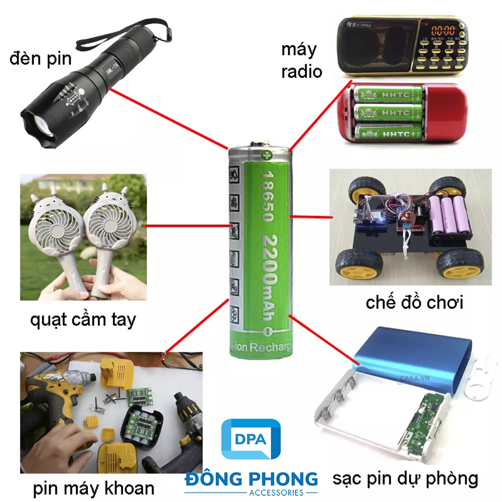 Pin Sạc 18650 4.2V 2200mAh Lithium-ion- Pin Sạc 18650 4.2V 2200mAh Lithium-ion được sử dụng phổ biến cho sản phẩm quạt siêu tốc cầm tay, loa, xe điện, đèn pin, thuốc lá điện tử, đèn led, đèn khẩn cấp, máy khoan vit, và các thiết bị điên tử khác.