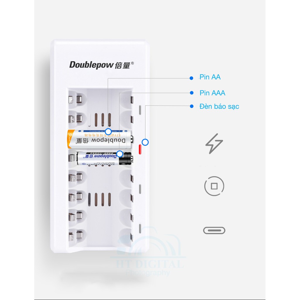 Sạc cùng lúc 8 viên pin sạc AA – AAA Tự ngắt điện khi pin đầyĐèn LED báo quá trình sạc. Báo lỗi khi sử dụng pin sạc 1 lần.