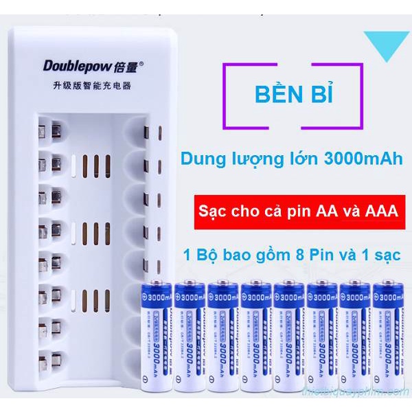 Bộ Pin sạc 8 viên AA 3000mAh là dòng Pin sạc chính hãng Doublepow, Pin có dung lượng cao, tốc độ sạc nhanh, trên Sạc có đèn led hiển thị báo hiệu Pin đã đầy, có thể sac được Pin AA và AAA, giúp người dùng dễ sử dụng. Bộ sản phẩm có rất nhiều tính năng vượt trội mà giá thành rẻ hơn các dòng có ưu điểm tương tự. Pin dùng cho nhiều loại micro thu âm, đèn led máy quay … với thời gian sử dụng lâu dài, không làm gián đoạn công việc.