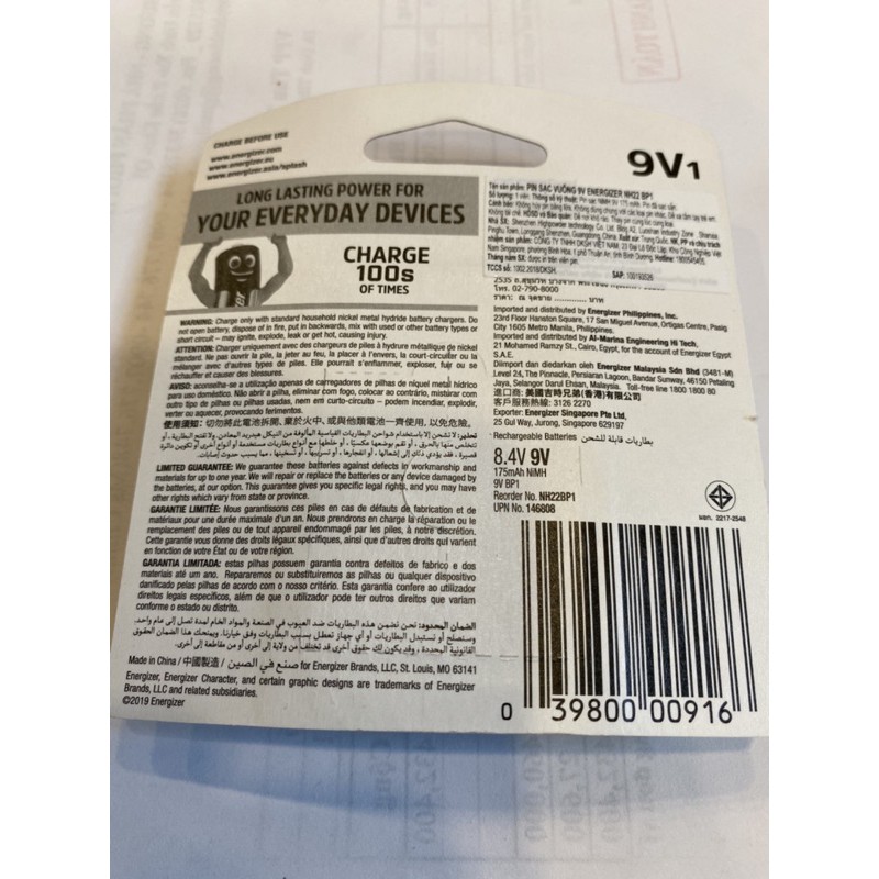 Pin sạc 9V Energizer NH22 175 mAh vỉ 1 viên chính hãng• Loại pin: Pin sạc / NiMH