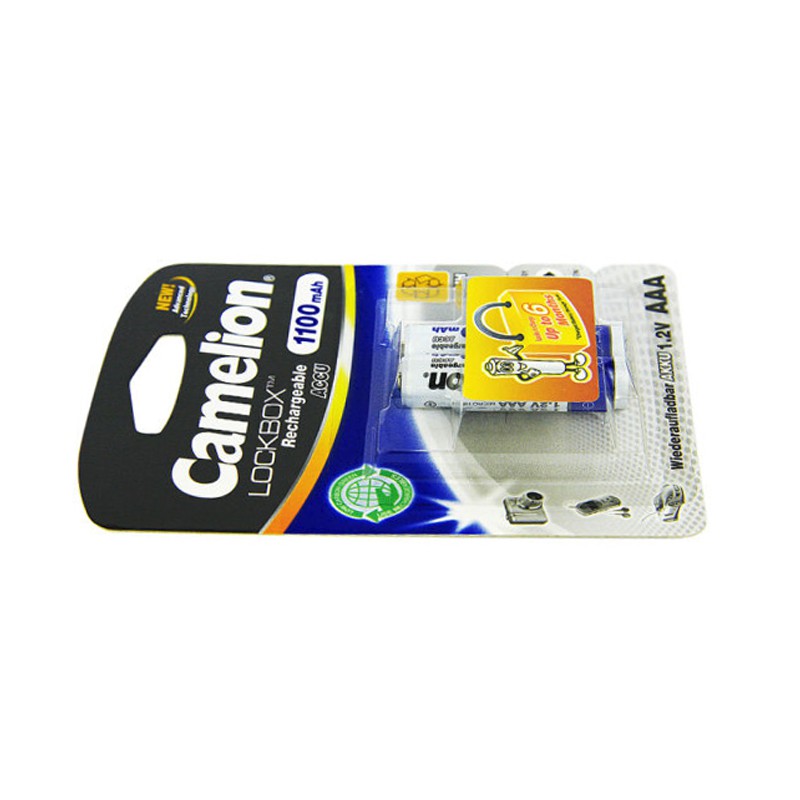 Pin sạc AAA Camelion 1100mAh 1.2V (1 vỉ 2 viên)Pin sạc AAA Camelion là pin cung cấp điện năng dồi dào cho các thiết bị thông dụng hàng ngày. Pin sạc AAA 1100mAh phù hợp với các thiết bị như đèn pin, điều khiển, đồ chơi, máy ảnh… Pin sạc AAA 1100mAh lưu trữ được nhiều điện năng, an toàn và tuổi thọ sử dụng cao. Khi sử dụng hết năng lượng tích trữ pin có thể sạc và sử dụng tiếp.