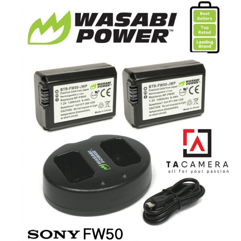 TA-Camera: Pin - Sạc Đôi Wasabi Cổng USB Cho Sony FW50 1300mAhWASABI FW50 Dùng cho : Sony Alpha 7, a7, a7ii, Alpha 7R, a7R, Alpha 7S, a7S, Alpha a3000, Alpha a5000, Alpha a6000, 6300 , 6500, NEX‐3, NEX‐3N, NEX‐5, NEX‐5N, NEX‐5R, NEX‐5T, NEX‐6, NEX‐7, NEX‐C3, NEX‐F3, SLT‐A33, SLT‐A35, SLT‐A37, SLT‐A55V, Cyber‐shot DSC‐RX10...