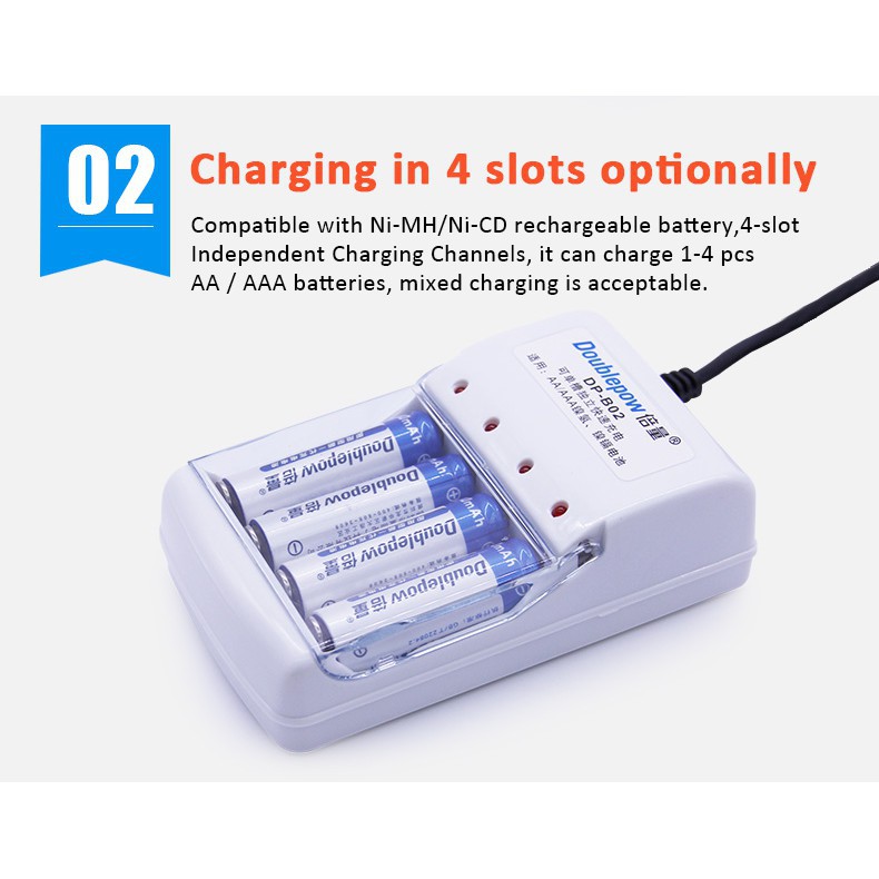 * 01 Sạc Doublepow DP-B02 sạc cùng lúc được 4 viên pin, Có thể sạc Pin tiểu AA hoặc Pin đũa AAA (Chuẩn pin 1.2V Ni-Mh, Ni-Cd).