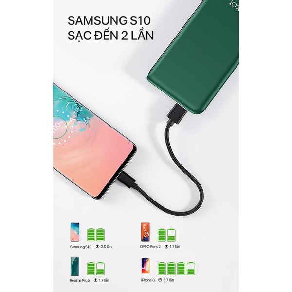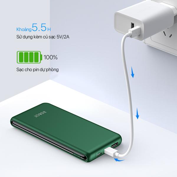 - Sử dụng với củ sạc nguồn 5V/2A, pin dự phòng được sạc đầy trong khoảng 5.5h