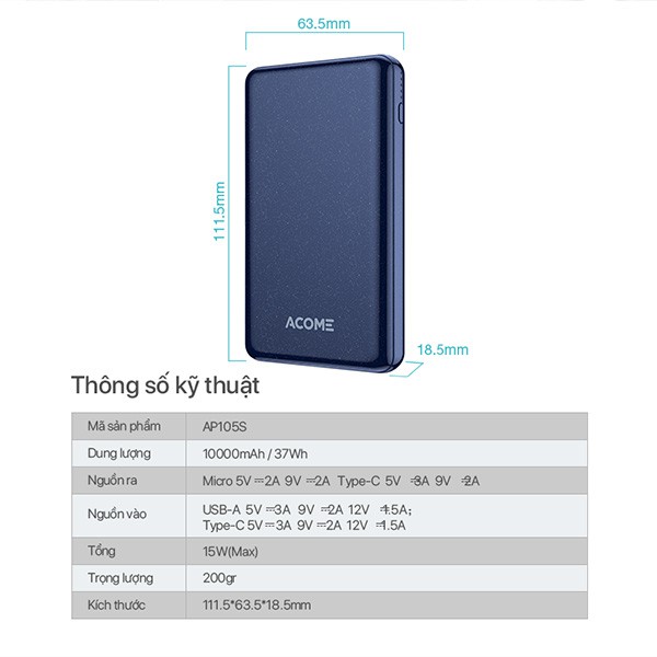 Pin Sạc Dự Phòng 10.000mAh ACOME AP105S Sạc Nhanh 18W PD/QC 3.0 - BẢO HÀNH 18 THÁNGThông số kỹ thuật: