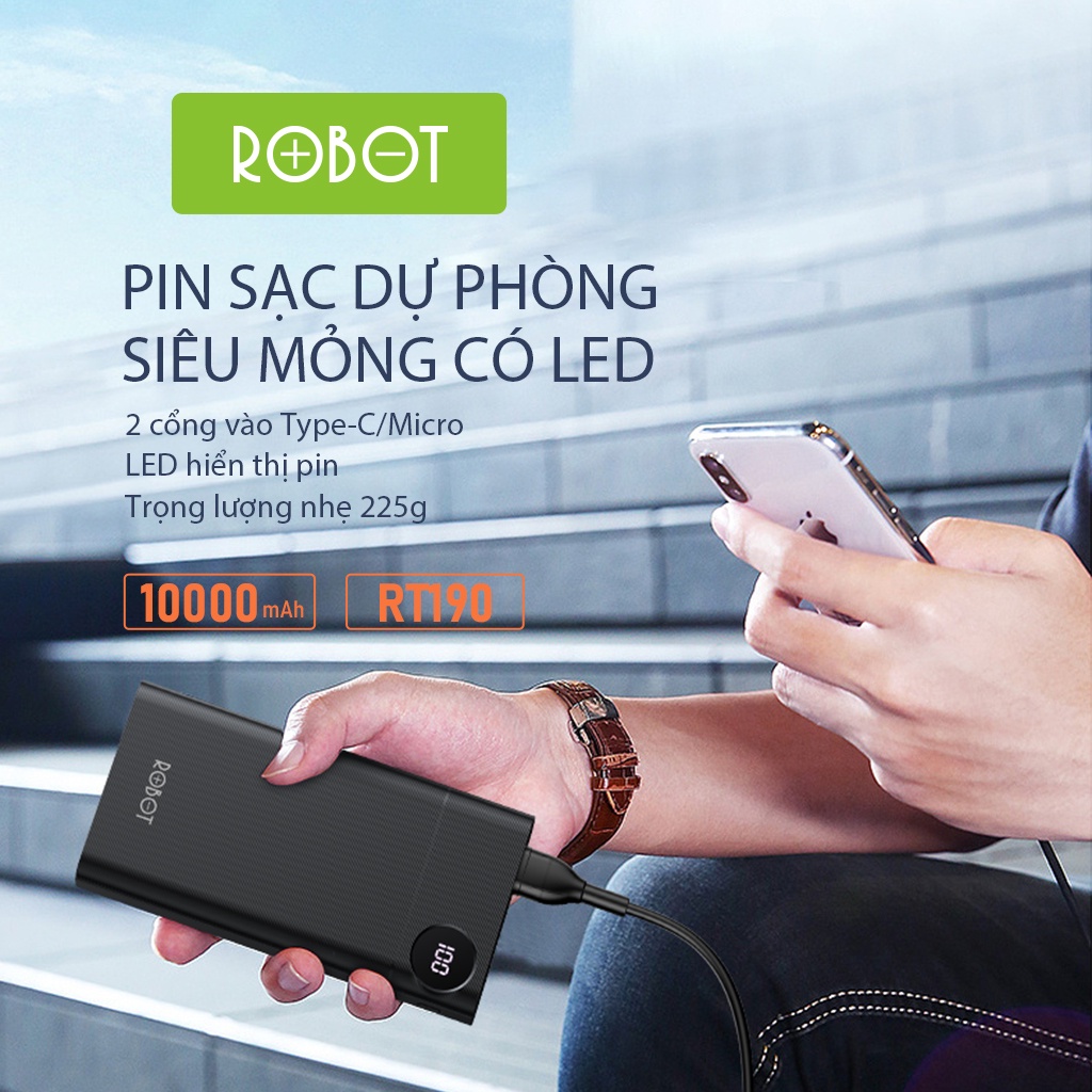 Pin Sạc Dự Phòng 10.000mAh ROBOT RT190 LED Hiển Thị PIN - 1 Output USB & 2 Input Micro/Type-C - BẢO HÀNH 12 THÁNGModel: RT190