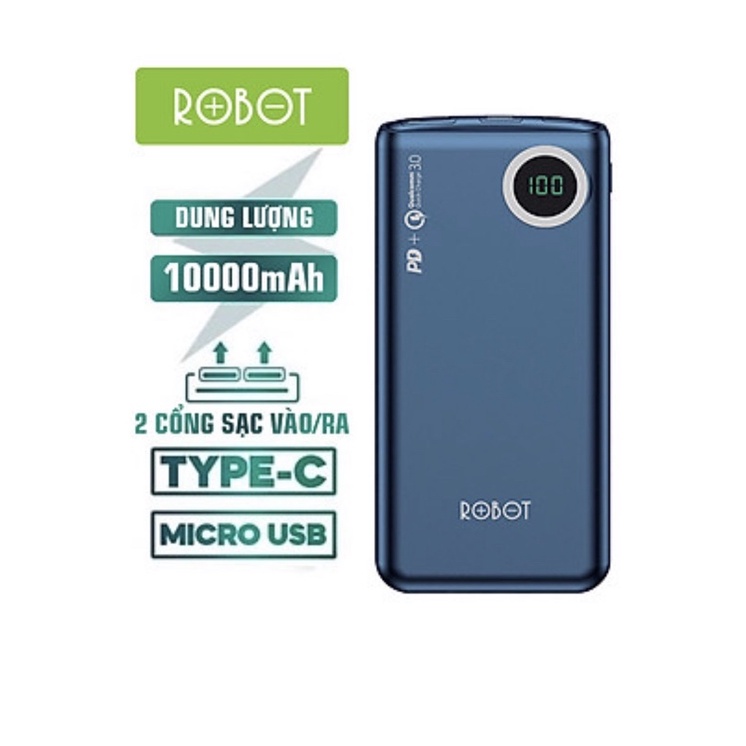 Pin Sạc Dự Phòng 10.000mAh ROBOT RT100Q - Chuẩn Sạc Nhanh PD/QC 3.0 18W, Đèn LED Hiển Thị Mức PIN