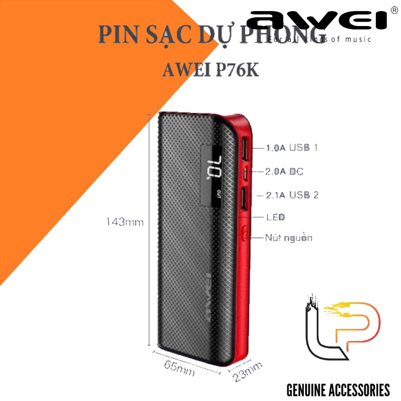 Pin sạc dự phòng chính hãng Awei P76KPin: 10.000mAh sạc đầy trong 3 - 4 giờ