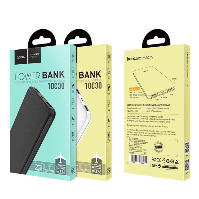 Sạc dự phòng Hoco J26 dung lượng 10000 mAh với 2 cổng ra USB dòng 2.1A và đầu vào Micro-USB có đèn LED hiển thị mức sạc. Hoco J26 có thể cùng lúc sạc được cho 2 thiết bị di động. Với kích thước tương đối mỏng và gọn, cầm tay rất thoải mái. Vỏ ngoài được phủ lớp chống trơn và chống trầy xước. Hiệu suất của J26 khi sạc đạt từ 60-70% có thể sạc được 2,1 lần đầy cho iPhone 7 Plus (Lưu ý quá trình sạc có tiêu hao năng lượng)