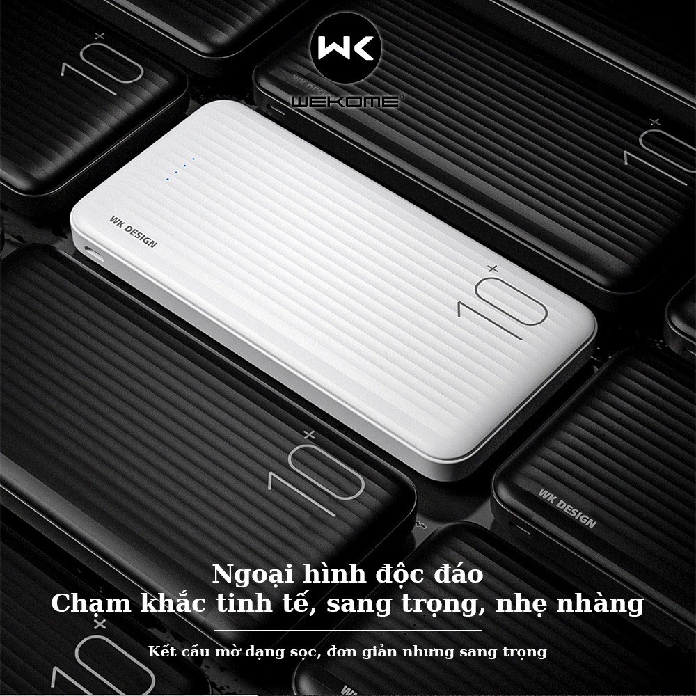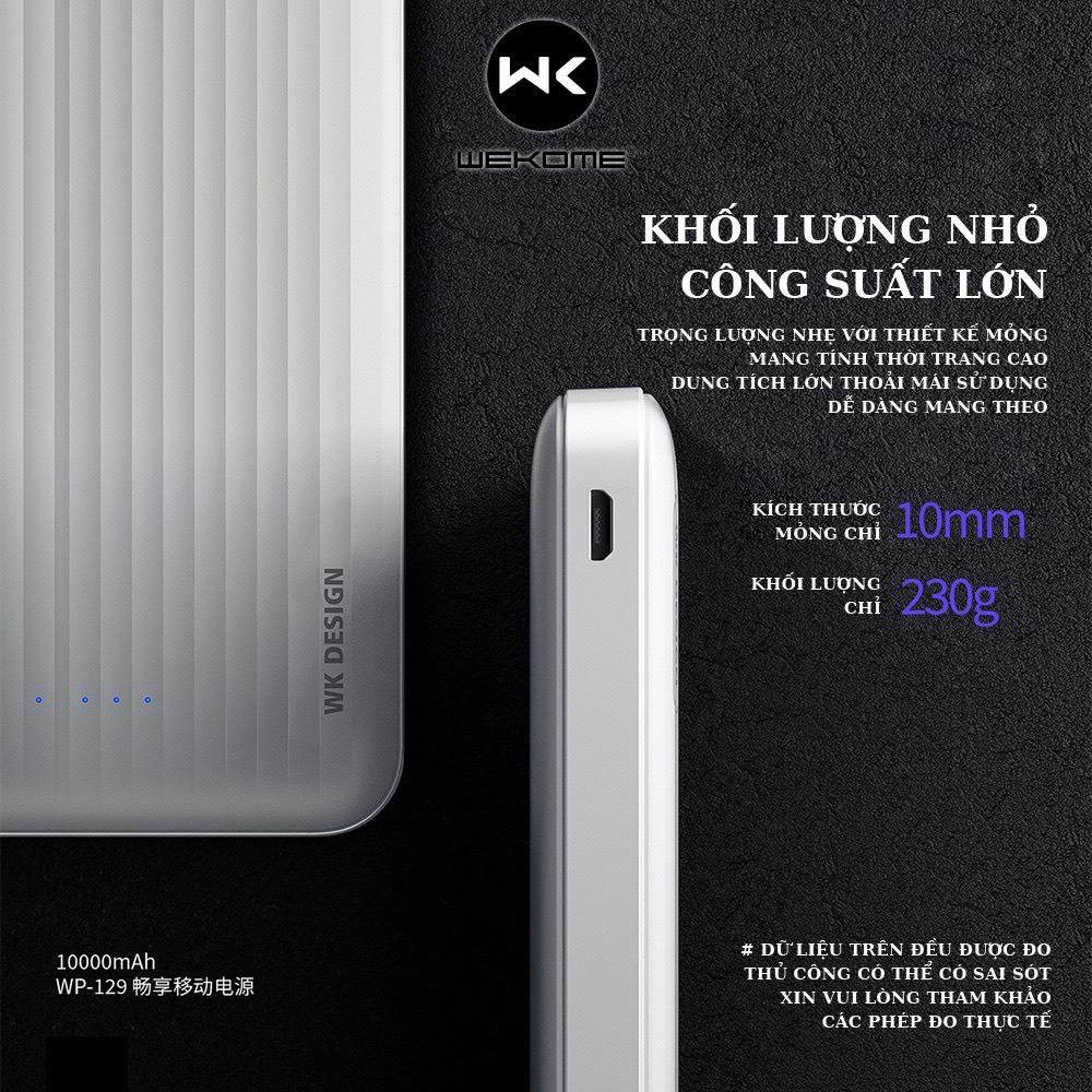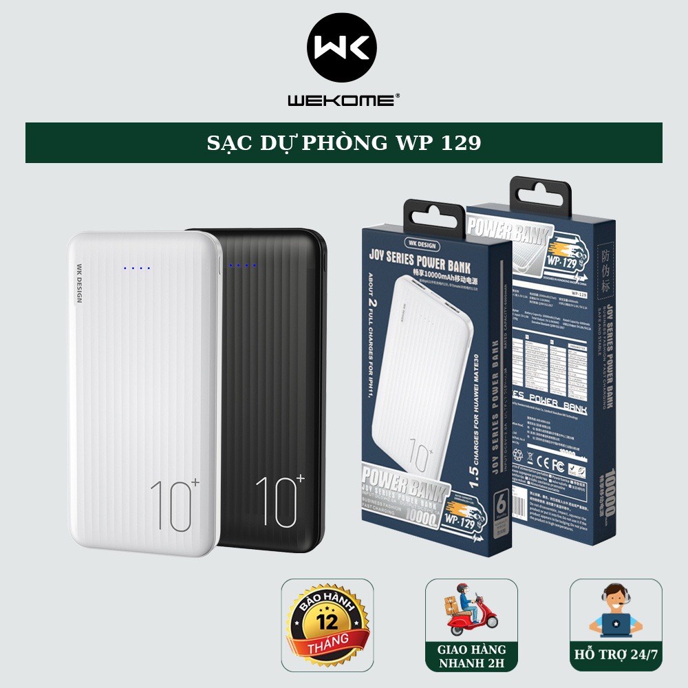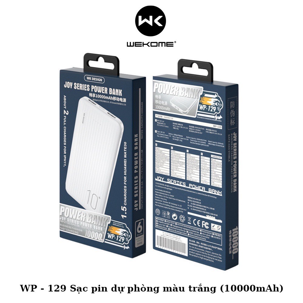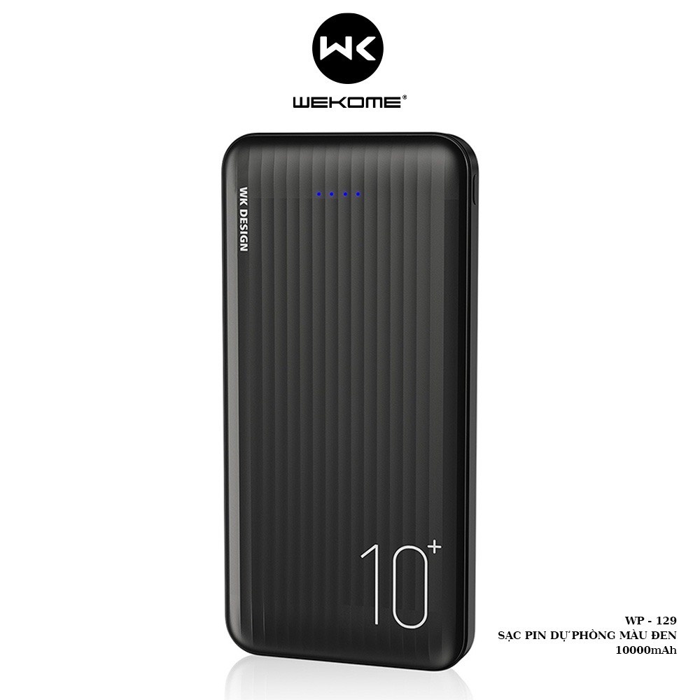 - Pin dự phòng Wekome WP-129 10000mAh với dung lượng lên tới 10.000mAh đáp ứng tốt các nhu cầu của người dùng. Không chỉ sạc được điện thoại nhiều lần mà còn có thể sạc cùng lúc tới 2 thiết bị. Giờ đây, khách hàng có thể thoải mái lướt web, chơi game, xem phim mà không lo sợ điện thoại bị tắt nguồn do cạn pin.