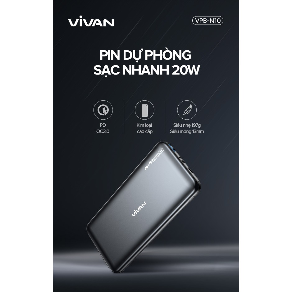 Giới thiệu Pin Sạc Dự Phòng 10000mAh VIVAN VPB-N10 20W Quick Charge PD/QC 3.0- 2Output Hàng Chính Hãng Bảo Hành 12 Tháng 1 Đổi 1