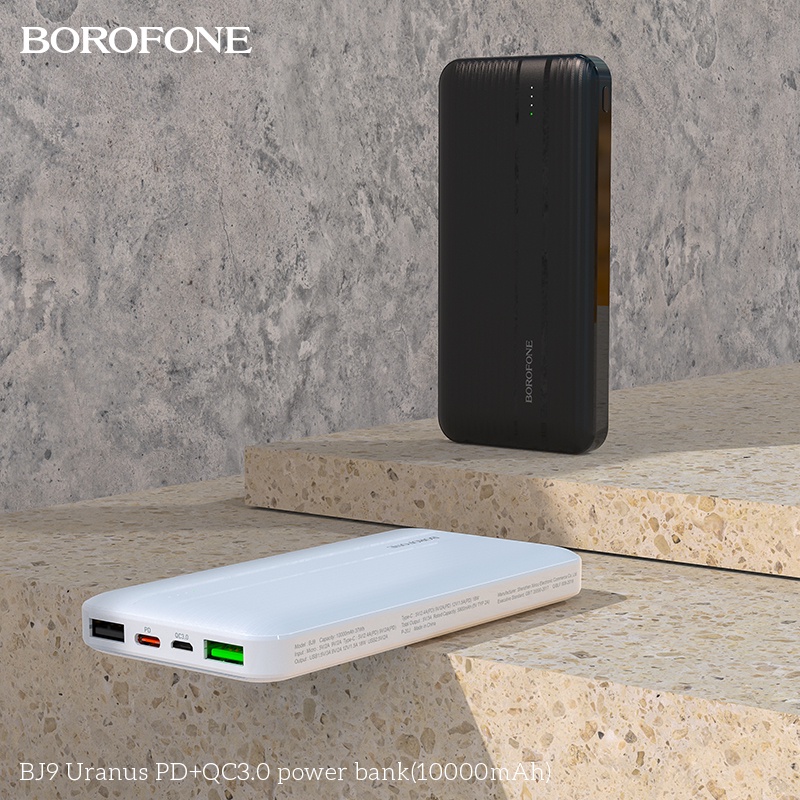 Pin Sạc Dự Phòng BOROFONE BJ9, 10000mah, Micro USB / USB C, 1 cổng Type-C hỗ trợ sạc nhanh PD20W và 2 cổng sạc USB 2A, Đèn Led hiển thị dung lượng pin là một sản phẩm của BOROFONE đến từ Hongkong, đây là thương hiệu chuyên sản xuất các phụ kiện dành cho điện thoại với các mức giá ở tầm trung nên được rất nhiều lựa chọn và tin dùng.