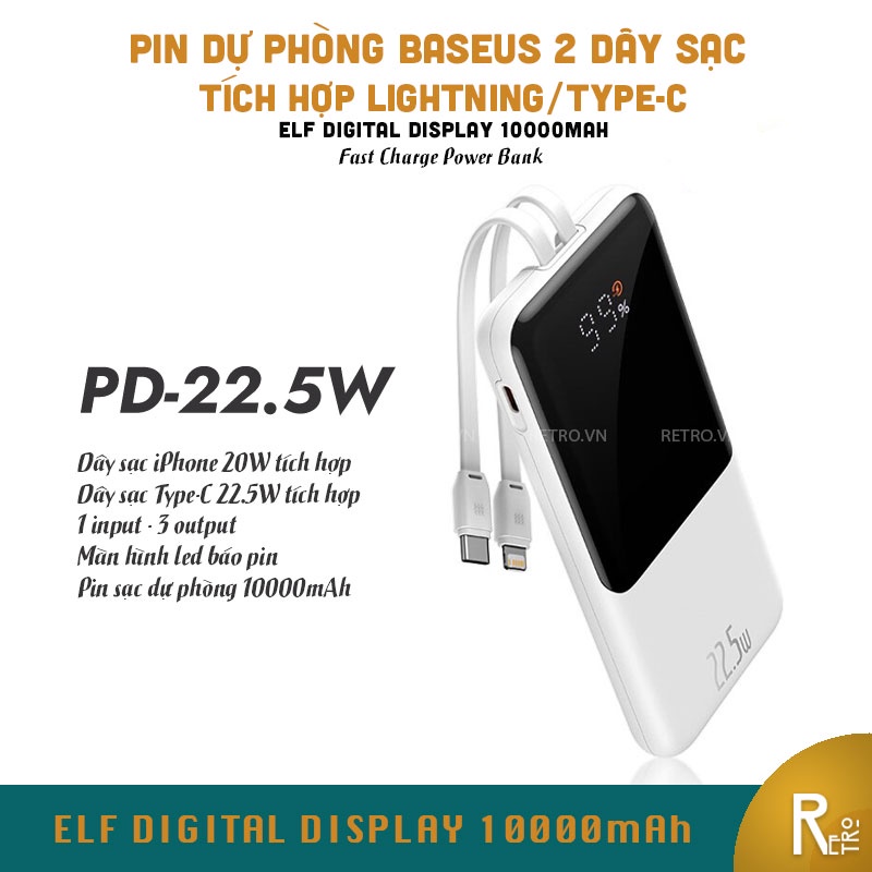 - Pin sạc dự phòng BASEUS Elf Digital Display trang bị cáp type-c tích hợp và cáp lightning với một cổng type-c bổ sung.