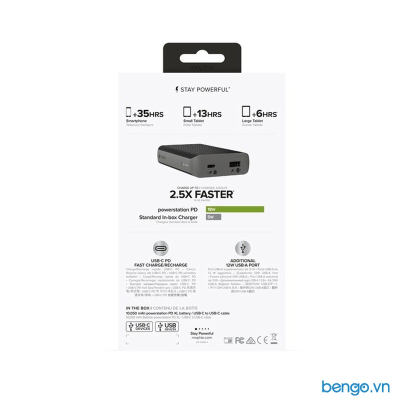 Pin sạc dự phòng Mophie Powerstation Fabric 10000mAh sạc thiết bị của bạn ở bất cứ nơi nào với dung lượng pin 10000mAh, sạc Smartphone 34HRS, Small tablet 14HRS, Large tablet 9HRS.