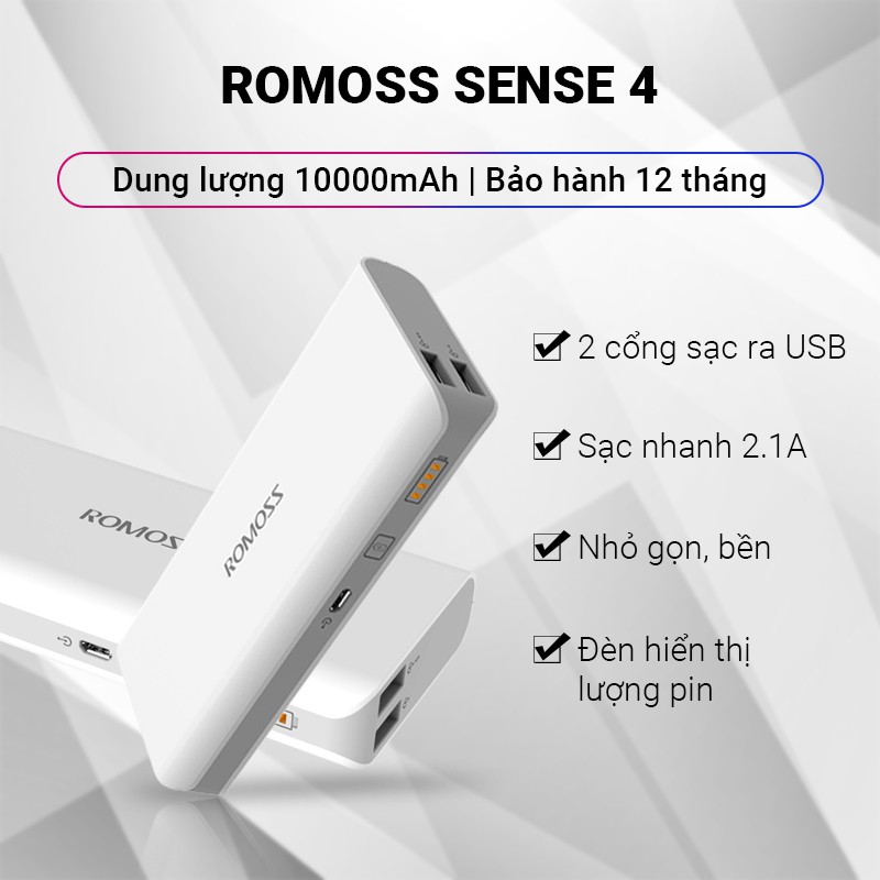 Pin sạc dự phòng 10000mAh Romoss Sense 4 hỗ trợ sạc nhanh tốc độ 2.1A, 2 cổng sạc ra USB, 1 cổng sạc vào Micro, nhỏ gọn