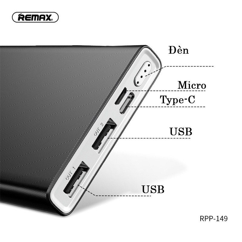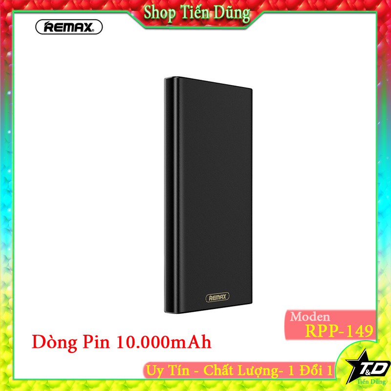 - Remax RPP 149 10.000mAh là pin sạc dự phòng mới, sở hữu thiết kế mới với 2 cổng giúp sạc nhiều thiết bị cùng lúc nhanh chóng.