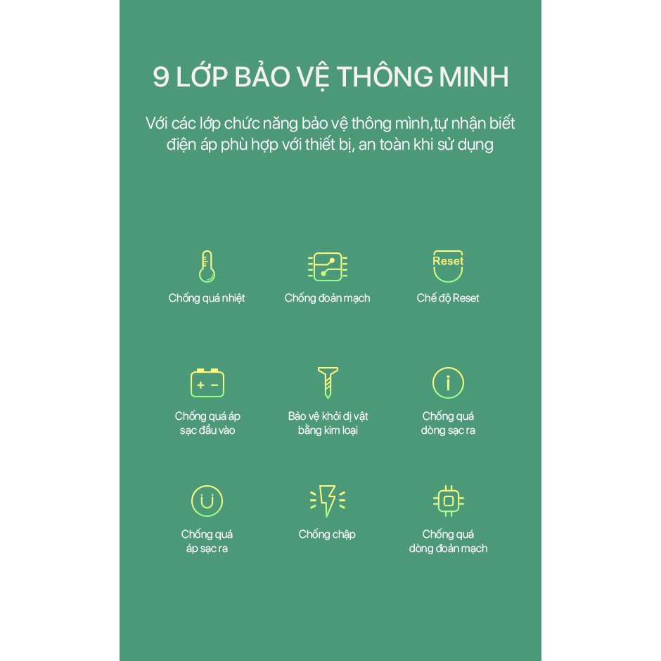 Nhiều lớp bảo vệ thông minh với các chứng năng tự nhận biết điện áp phù hợp với thiết bị, an toàn khi sử dụng: chống quá nhiệt, chống đoản mạch, chế độ Reset, chống quá áp sạc đầu vào, chống quá dòng - quá áp sạc ra, chống chập, chống quá dòng đoản mạch