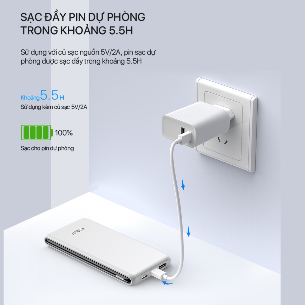 ✔Sử dụng với củ sạc nguồn 5V/2A, pin sạc dự phòng dược sạc đầy trong khoảng 5.5H