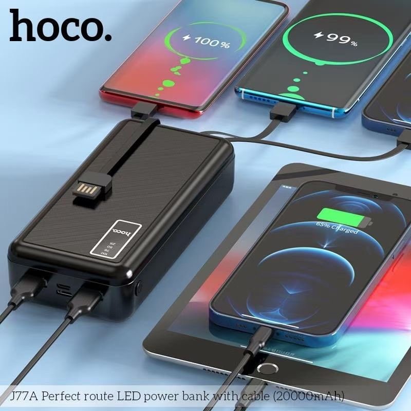 Hoco J77 được thiết kế cực kỳ độc đáo, có sẵn 3 dây sạc ra đi liền với pin nên có thể sạc được tất cả các thiết bị và còn có 2 cổng USB => có thể sạc cùng lúc 5 thiết bị, ngoài ra để sạc cho pin thì đã có sẵn 1 cáp USB-A liền pin, chỉ cần cắm vào củ sạc hoặc ổ điện có cổng USB là có thể sạc được, cực kỳ độc đáo và tiện lợi.