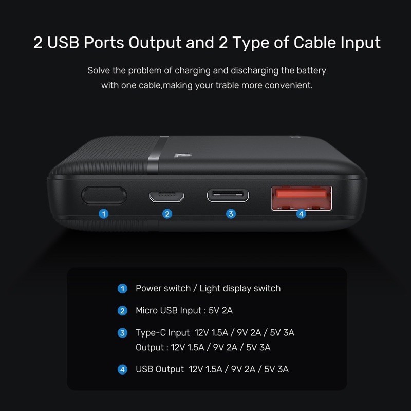 ☀ Cổng đầu vào: Type-C, Micro 5V2A / 9V2A