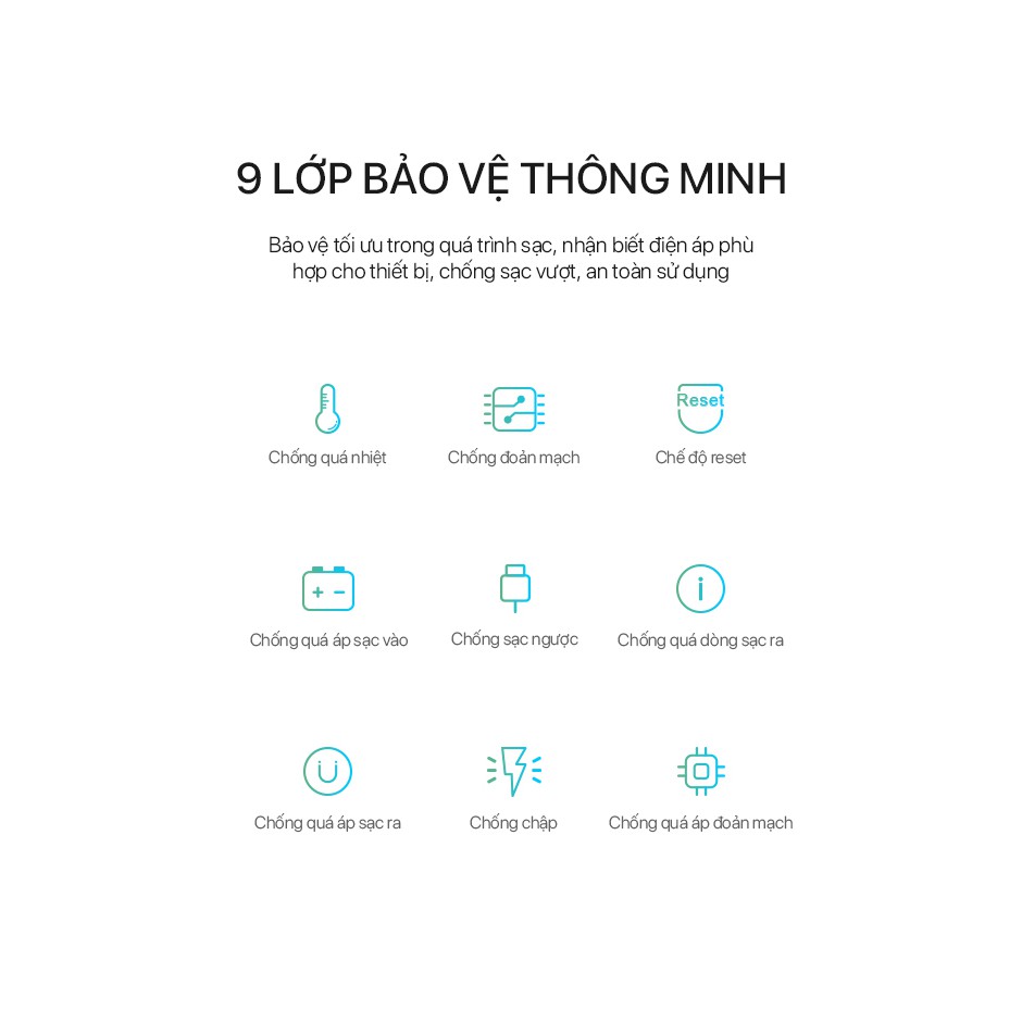 9 lớp bảo vệ thông minh: chống quá nhiệt, chống đoản mạch, chế độ reset, chống quá áp sạc vào, chống sạc ngược, chống quá dòng sạc ra, chống quá áp sạc ra, chống chập, chống quá áp đoản mạch